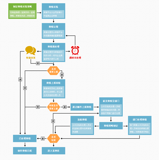 • 部门处理舆情:部门根据公关及危机处理人员制定的舆情处理策略,对舆情进行响应;