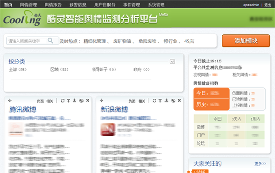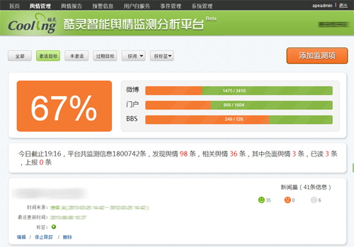 酷灵舆情为舆情管理员提供了对监测目标进行定制的功能。舆情管理员通过定制,实现了对用户所关心的区域内的政治、经济、交通、司法、教育、医疗、环保等领域舆情的监测、并可根据需要随时调整监测目标。