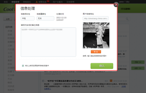 酷灵舆情为舆情管理员提供了便捷的处理方式。舆情管理员能够通过分类,监测目标,热点词,关键词,情感色彩,相关程度,时间范围等多类条件从海量的监测目标中用最短的时间发现最有价值的舆情。对于已发现的舆情,用户可以对其进行处理,处理内容包括:对信息倾向性进行修改、对信息相关性进行修改、给当前处理信息添加备注、给当前处理信息添加图片以及对相似信息进行合并。