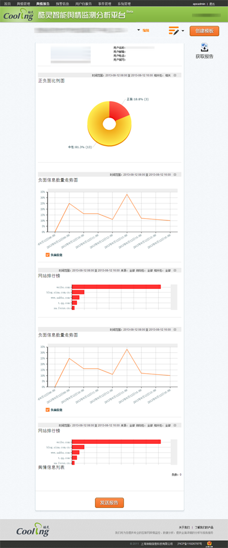 酷灵舆情为用户提供了多种舆情报告模板以及个性化的模板编辑工具,借助于强大的统计与分析功能,帮助舆情管理员定制出各种类型的报告。